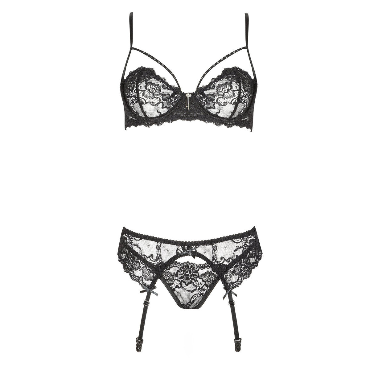 Verleidelijke 3-delige set van fijne materialen met geïntegreerde beugels en verstelbare bandjes.