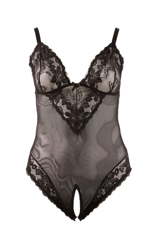 In deze sexy zwarte body komen jouw vrouwelijke vormen volledig tot hun recht. Het doorschijnende materiaal is elastisch waardoor het perfect aansluit op jouw lichaam. Daarnaast is deze body voorzien van kanten cups en kanten details die het geheel nog verleidelijker maken. Kan jouw partner zich niet langer beheersen? Ook dan kun je deze body gewoon aanhouden. Door het open kruis kan jouw partner gewoon ongestoord bij de fijnste plekjes komen zonder dat jij de body hoeft uit te trekken!