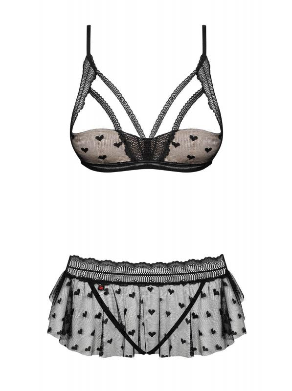 Voel je sexy in deze opvallende 3-delige Heartia set van Obsessive. Deze set bestaat uit een BH met open cups en verstelbare bandjes, een niets verhullende string en een bijpassend rokje met elastische band. Deze set heeft een print van romantische hartjes en is gemaakt van elastisch materiaal voor een mooie pasvorm.