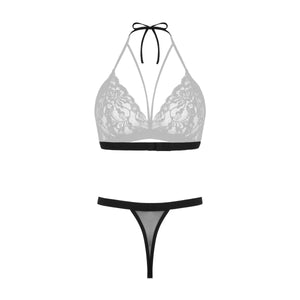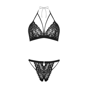Sensueel kanten setje, bestaat uit een triangelbh ( niet voorgevormd) en een string met open kruis. De bh sluit met een bandje in de nek en heeft ook langs de cups speelse bandjesdetails. Aan de achterkant een haakjessluiting. Het kant is elastisch en zacht. Fijne pasvorm.