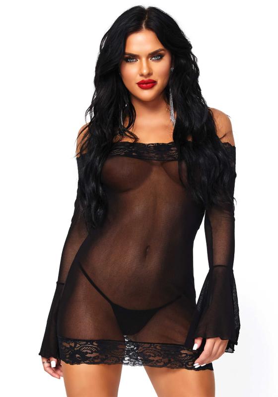 Dit transparante off-shoulder jurkje heeft lange mouwen, een comfortabele pasvorm door zijn elastische materialen en is geschikt voor de maten S t/m L. Bij het jurkje wordt een bijpassende string meegeleverd.