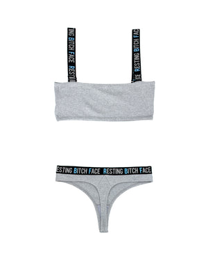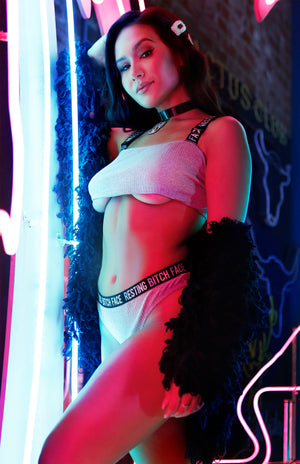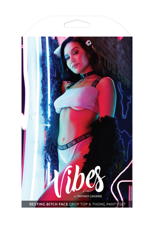 Creëer een sexy en uitdagende look met deze 2-Delige set van het merk Vixen. De set heeft een crop top met elastische en verstelbare brede bandjes die de borsten gedeeltelijk vrij laat. Op de bandjes staat de tekst "Resting Bitch Face". Het materiaal voelt zacht aan en is van een gebreide ribkwaliteit. De bijpassende string maakt deze set compleet.