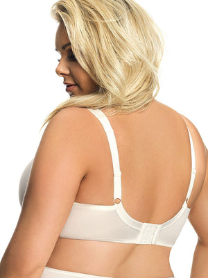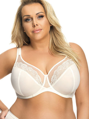 Elegante, crèmekleurige zachte bh met beugel. Goed voor middelgrote en grotere borsten. Siert het decolleté heel mooi, vooral dankzij het delicate kant in duet met lichte tule, die het decolleté afwerken. Verstelbare bandjes, aangepast aan de maat.