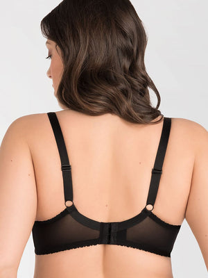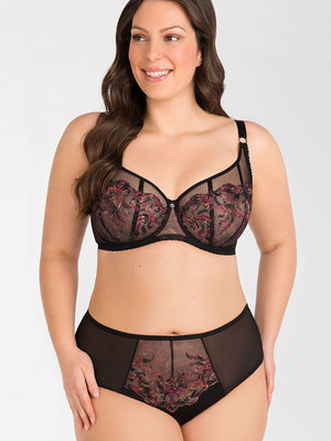 Zwarte K793 Jenny balconette bh van dubbel transparant mesh, versierd met kleurrijk borduursel. De bh is ideaal voor alle type borsten en heeft een verhoogde en gemodelleerde halslijn. De buste is naar binnen gerimpeld en licht afgerond. De bh heeft een haak-en-oogsluiting en niet-verwijderbare, verstelbare bandjes.